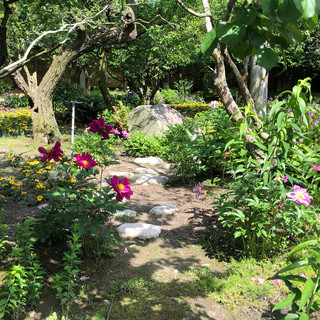 お庭では、桜、チューリップ、薔薇園、ベゴニアガーデンなど、年中様々なお花が咲いています。私たちが行った時は、オオイヌノフグリのじゅうたんが広がっていました!